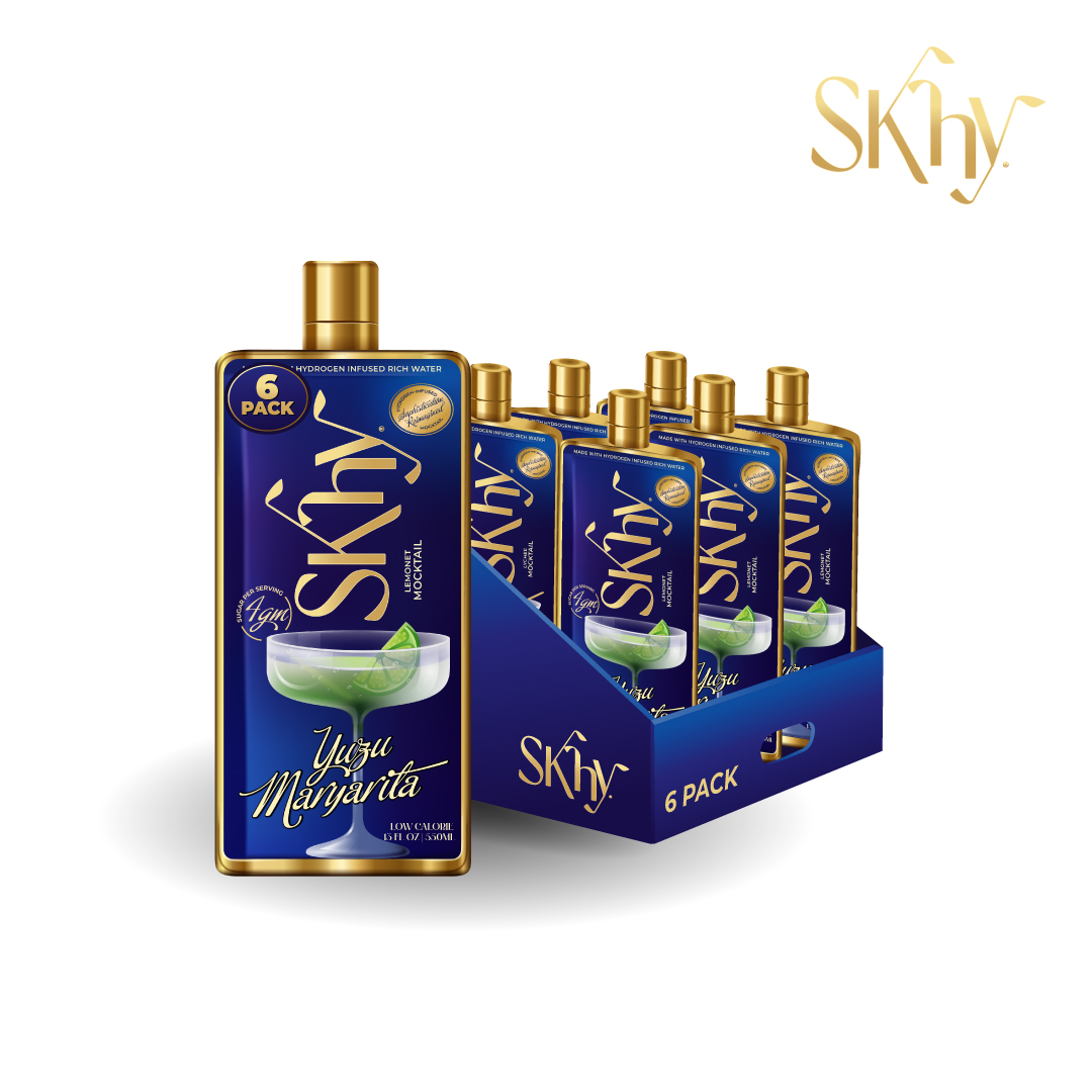 Each SKHY mocktail is a refined, functional cocktail alternative that delivers flavor complexity, emotional uplift, and a clean, refreshing finish — with low sugar, low calories, and no alcohol.in a 12 oz aluminum pouch.  SKHY begins with ultra‑purified water infused with molecular hydrogen — nature’s smallest molecule — known for its ability to penetrate tissues and support cellular hydration and antioxidant balance. We pair this next‑generation hydration with thoughtfully selected adaptogens and nootropics, including ashwagandha, panax ginseng, L‑theanine, and magnesium, to support calm focus, social ease, and balanced energy.